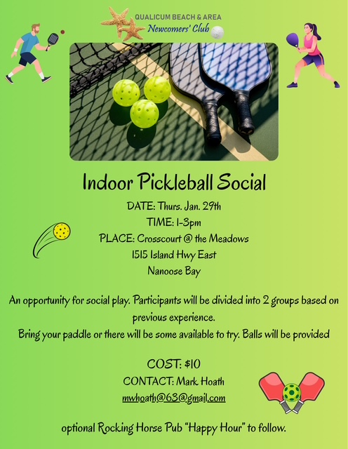 Indoor Pickleball Social Date: Thursday, January 29thTime: 1:00 PM – 3:00 PM Location:Crosscourt @ the Meadows1515 Island Hwy EastNanoose Bay Details:An opportunity for social play. Participants will be divided into two groups based on previous experience.Bring your paddle, or there will be some available to try. Balls will be provided. Cost: $10 Contact:Mark Hoath📧 mwhoath@63@gmail.com […]